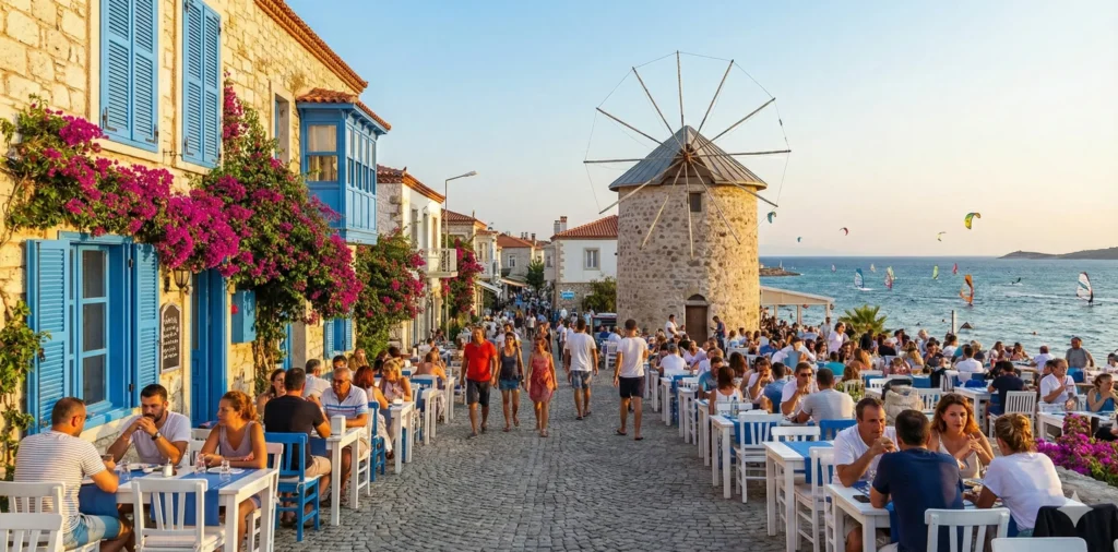 Another reason to choose Alacati for a holiday is the variety of experiences packed into a small area. You can spend the day at a calm, shallow-water beach like Ilica, try windsurfing in Alacati’s world-famous bay, then return to town for a long holiday dinner featuring Aegean olive oil dishes and fresh seafood. Compared to larger resort destinations in Turkey, an Alacati holiday feels more “local luxury”—less about all-inclusive resorts and more about intimate places with character.